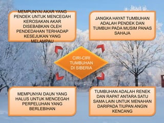 Menggalakkan pertumbuhan hutan mediterranean yang terdiri daripada hutan bangkut dan pokok tirus di kawasan tanah tinggi. Pain merah Bab 3 Paper birch Dahurian larch 45 Contoh hidupan liar Martens Mink Beruang kutub Harimau Siberia Siberian Wolf Lynx. Iklim Siberia meliputi kawasan yang sangat luas iaitu.